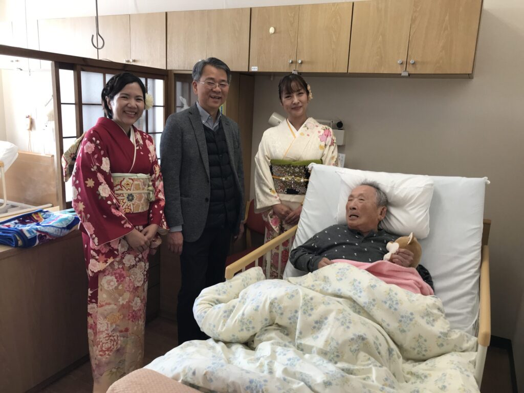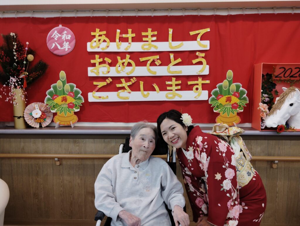 お正月期間中、職員2名が着物を着用して皆様をお迎えいたしました。 館内が一気に華やぎ、「やっぱり着物はいいわね」「お正月らしくて素敵!」と、入居者の皆様も大変喜んでくださり、あちこちで記念撮影が行われる賑やかなひとときとなりました。