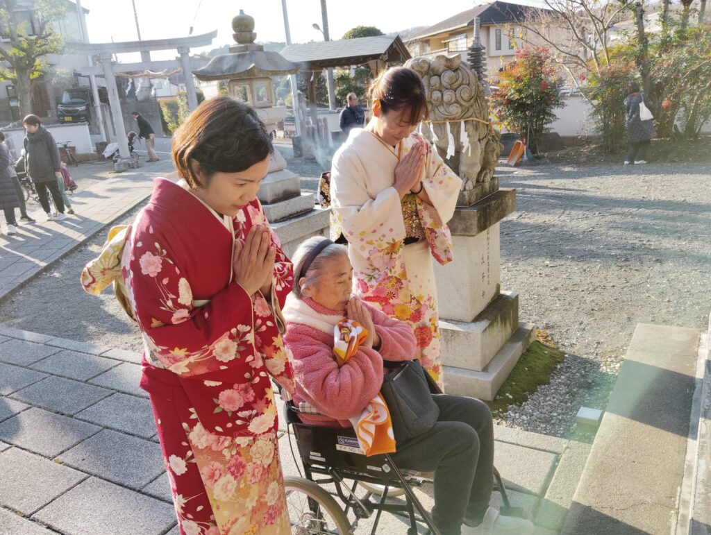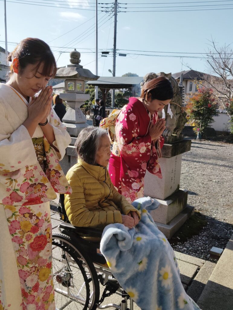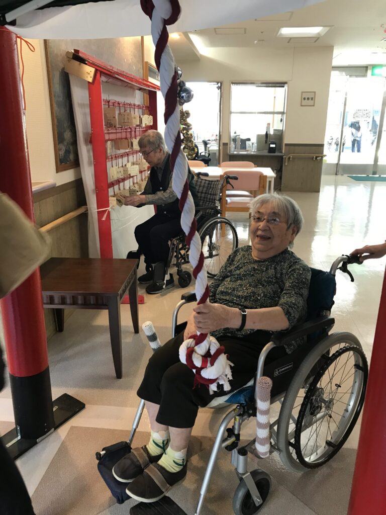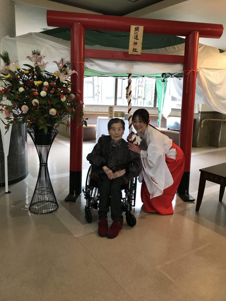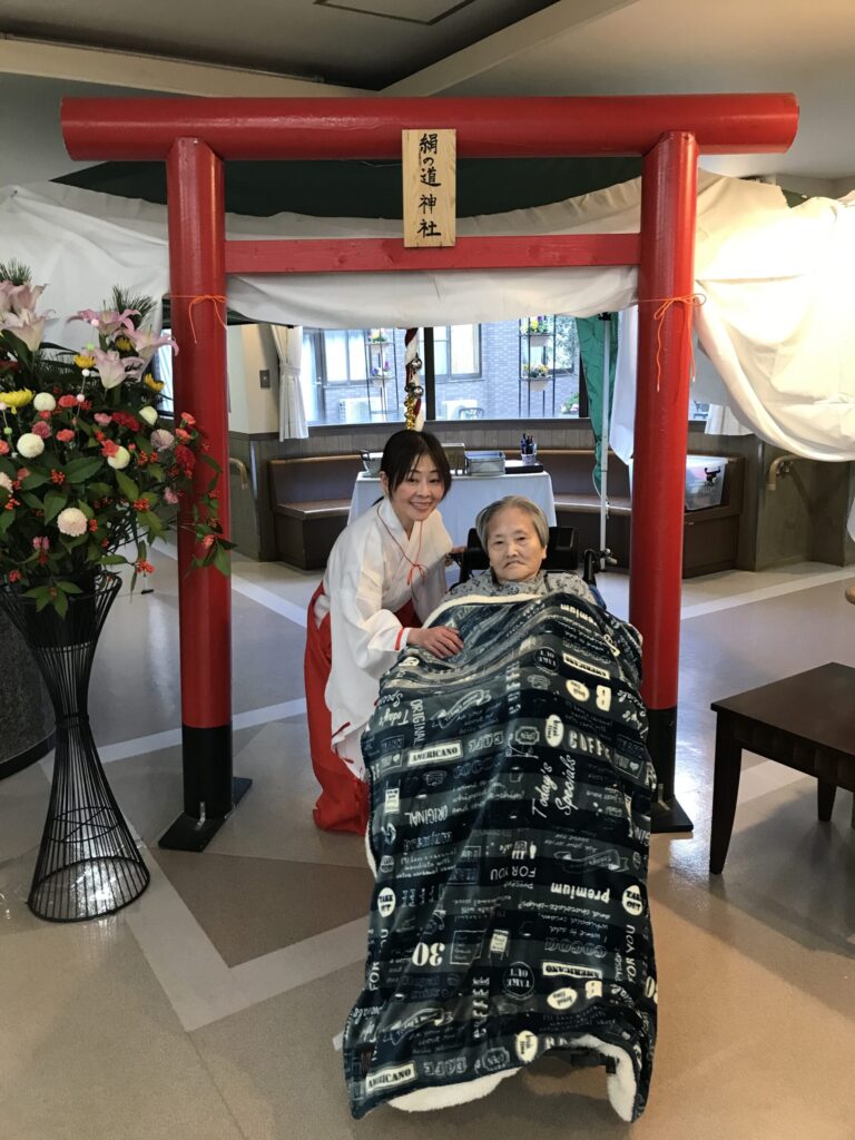 今年は代表の入居者様とともに、近隣の「愛宕神社」へお参りに伺いました。 また、外出が難しい方にも初詣の雰囲気を味わっていただくため、館内には職員手作りの「絹の道神社」を設営。