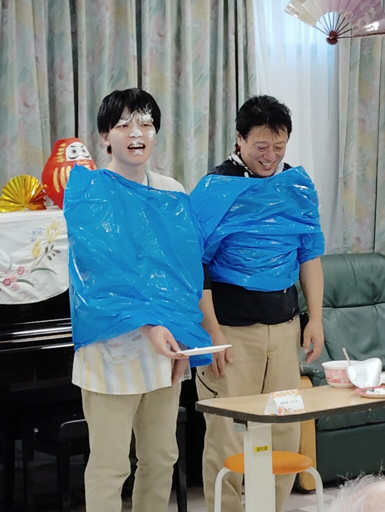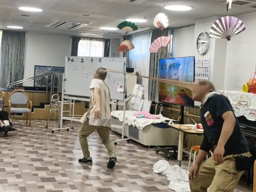1月4日には、皆様お待ちかねの「お正月会」を開催いたしました。 職員による余興の時間は、まさに笑いのご利益たっぷり!