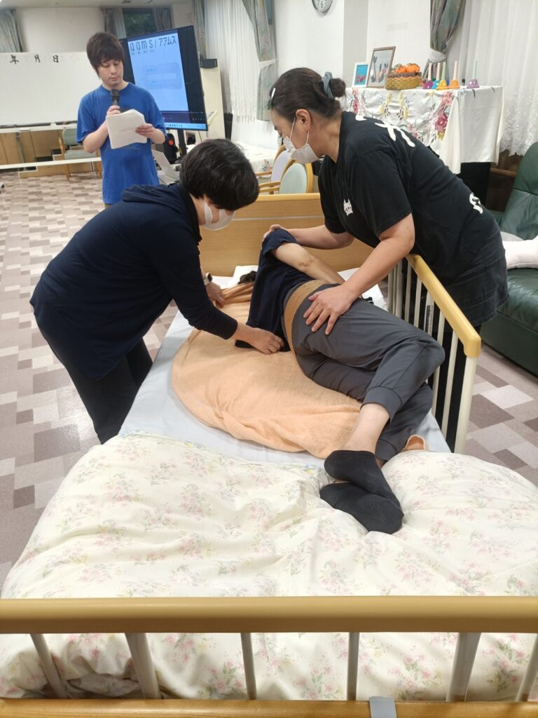 続いて、身体介護の実演を行いました。移乗や姿勢の整え方など、日頃の介助の様子をそのままにご覧いただきました。