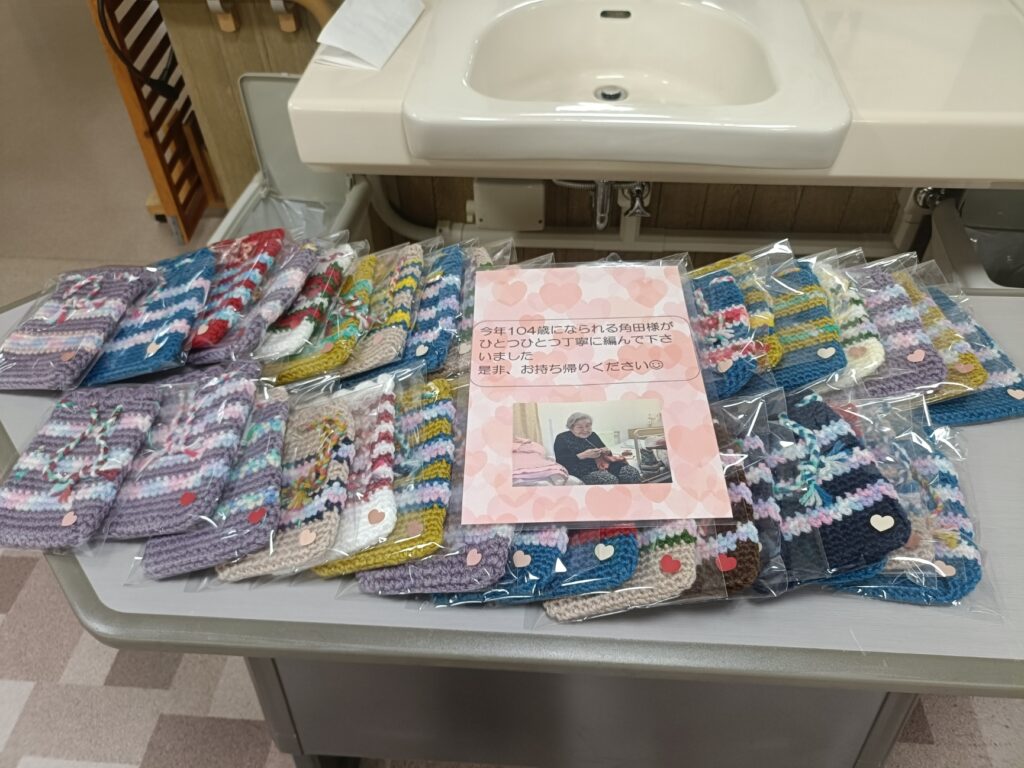またお土産として、104歳のご利用者様が編まれた巾着袋 をお一人ずつにお渡ししました。温かい手仕事に多くの方が笑顔になっていらっしゃいました。